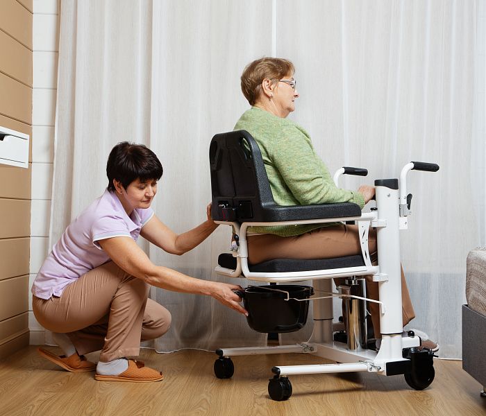 Кресло-туалет с откидными поручнями и регулируемой спинкой может потребоваться на начальном этапе реабилитации, когда пациенту только разрешают принимать сидячее положение.